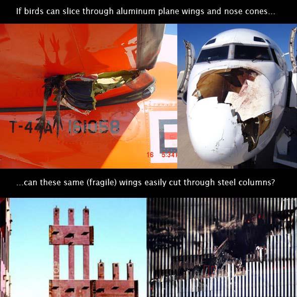 The media and the government would have the public believe that an aluminum plane can pierce into a building ringed with steel columns, and after cutting through those columns, continuing to cut through even thicker columns in the core of the building. Below are examples of what happens to a plane when it collides with a bird. Birds are light, which is how they are able to fly. Yet, look at the damage the birds do to an aircraft. If a bird can do that degree of damage to a plane what chance would a plane have against robust steel columns at the World Trade Center?
