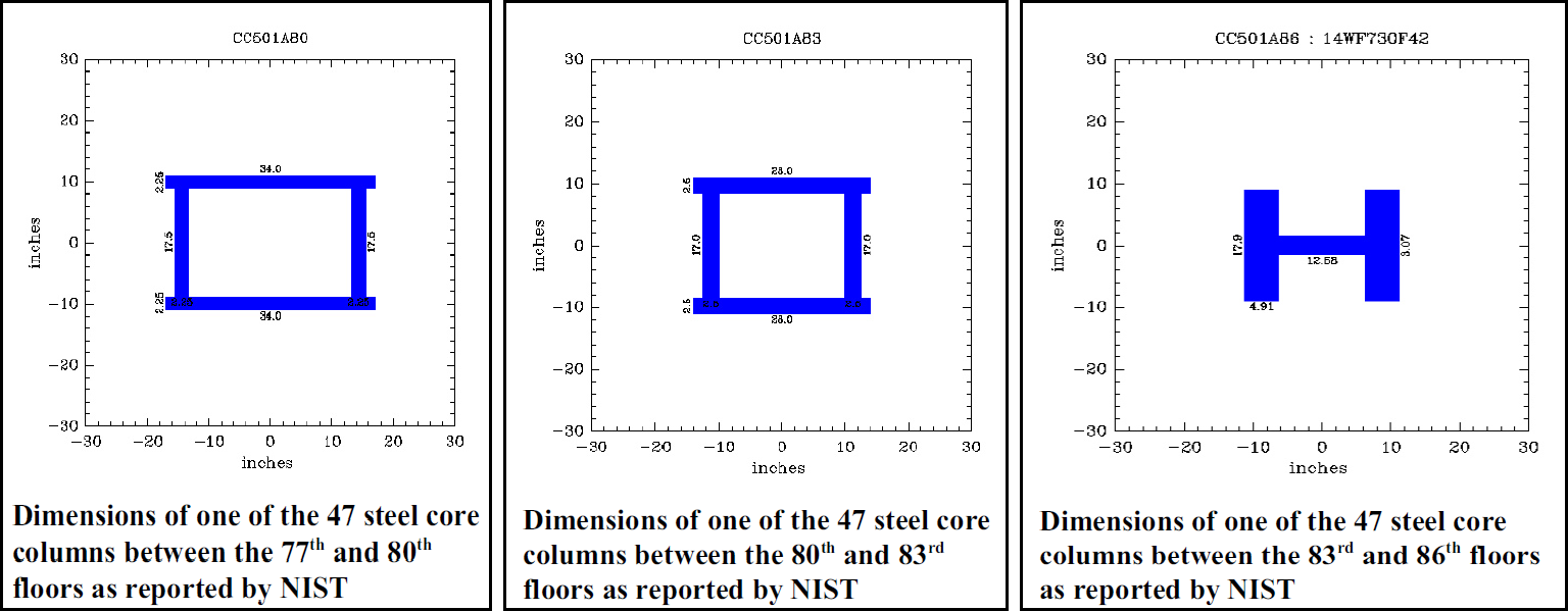 As the core columns progressed to the upper floors, they became smaller in size as seen in the diagram of the columns for WTC floors 80 to 83. The core columns transitioned to massive I beams that spanned from the 83rd to the 86th floor, as depicted in the diagram of the dimensions of those I beams.