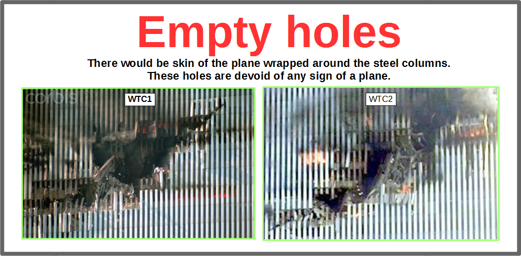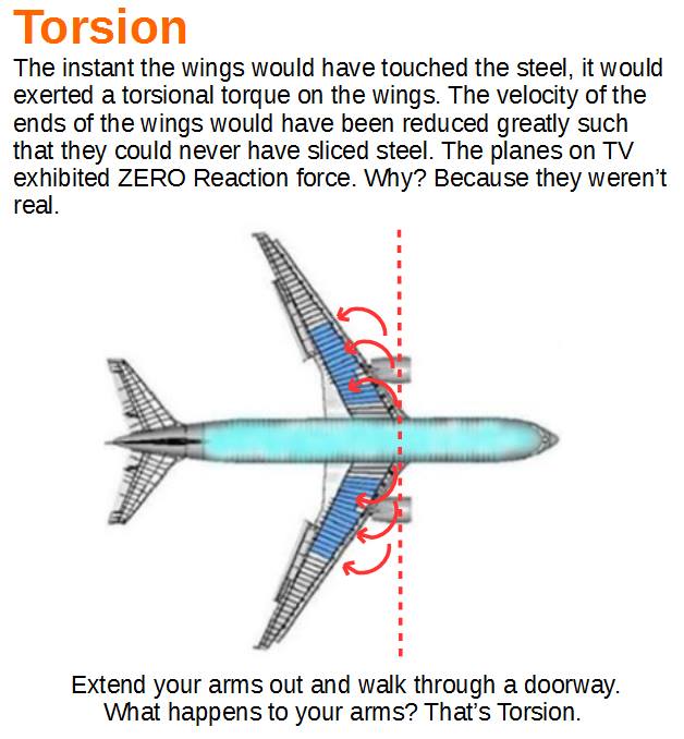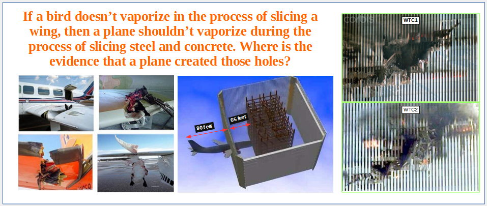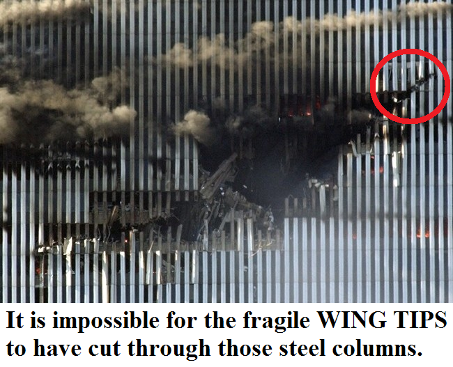 There are many things wrong with the 9/11 plane theory but one is the proposition that 767 wings can stay intact/attached in a high-speed, violent collision with a maxi-strength tower and those wings disappear inside said tower. Not to mention heavy tail sections disappearing within too. And such unprecedented (alleged) crashes occurred twice within 16.5 minutes? Wow. To paraphrase Gerard Holmgren, why don’t we have rotary aluminum blades and hacksaws for cutting steel today?