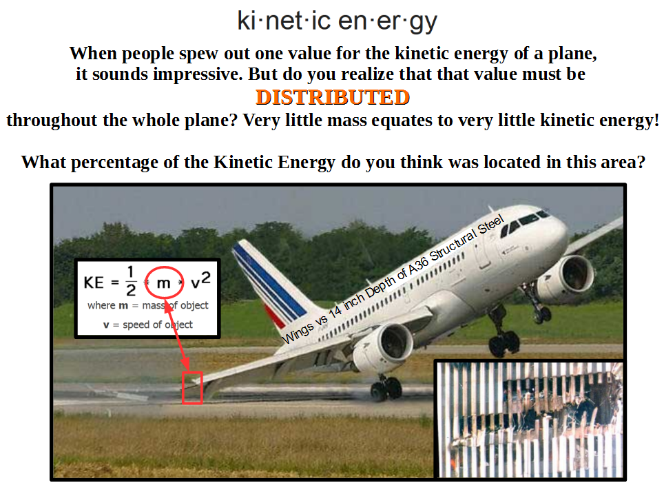 Question: Believers in Boeing 767s hitting the twin towers always bring up kinetic energy as the big explanation for how an aluminum plane could fly right through the wall of a steel and concrete tower. Speed squared is supposed make us believe the plane-like outline of the holes in the towers.