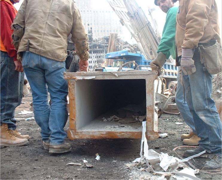 The massive core columns of the World Trade Center were anchored to bedrock. Thirty one of the columns were 36-by-16-inch box shaped columns made of two-inch thick solid steel at the foundation. Sixteen of the columns measured 52 inches by 22 inches triple thick steel boxes that were 5 inches thick at two ends matched perpendicularly with one 6 ½-inch and two 6-inch thick slabs of steel.