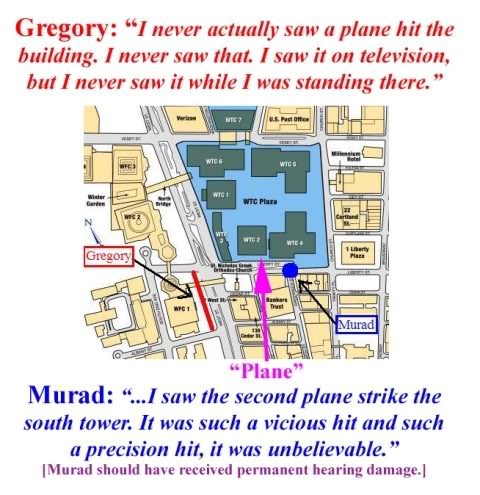 767 jetliners, made of aluminum, seeming to penetrate solid structural steel from nose to tail, wing-tip to wing-tip, without exploding, without slowing, without degrading, crumpling or losing a single part, disappearing through an undersized airplane silhouette of passage appearing an unknown time after the plane image disappeared and without a widely-heard deafening sound of a jetliner at full throttle being present. Moreover, the south tower explosion appears in the wrong place at the wrong time.