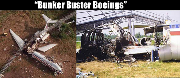 The 74 mph “git off” caused this 737 Pegasus airliner to break the fuselage into three major pieces, including the inverted torn-off front section. Planes, to put it bluntly, are flying tin cans–well, aluminum cans–and when they crash, they break into pieces. There is no way in hell they can disappear into steel/concrete towers, sturdy stone structures like the Pentagon, or deep into the earth. They are fragile in violent collisions up against most any substantial agglomerations of matter!